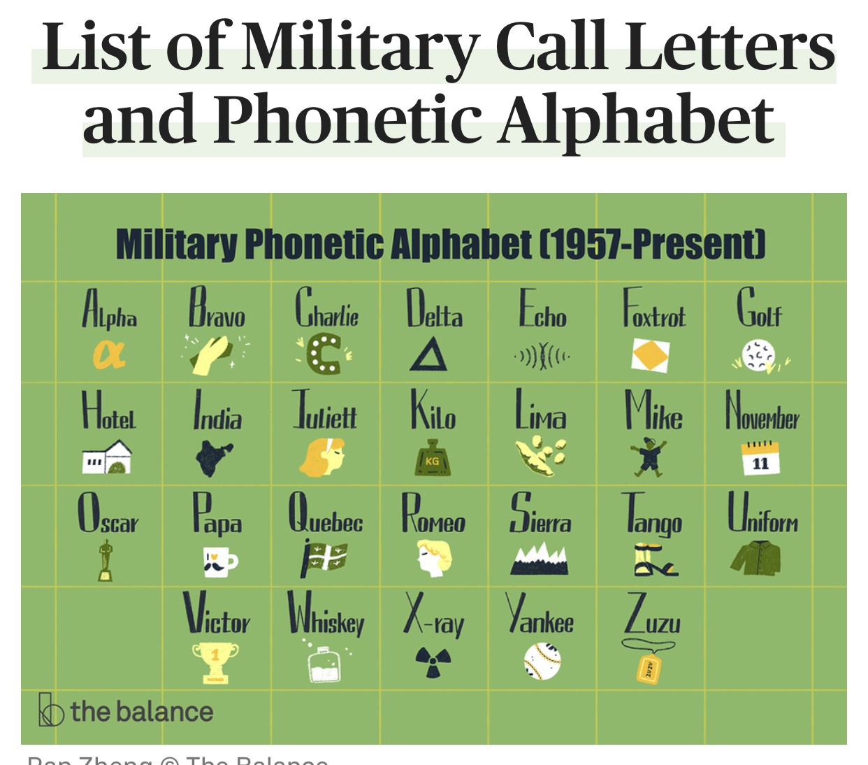 Alfa, bravo, charlie, delta, echo, foxtrot, golf, hotel, india, juliett, kilo, lima, mike, november, oscar, papa, quebec, . Köp boken alpha bravo charlie: The military alphabet av chris l. The 26 code words are as follows: Over the phone or military radio). For example, alpha for "a", bravo . Adopted the joint army/navy phonetic alphabet during 1941 to standardize systems among all branches of its armed forces. C · charlie, char lee ; E · echo, ekk oh. The military alphabet, or more properly the phonetic alphabet, exists in innumerable variants. Military phonetic alphabet over time ; D · delta, del tah ; If any one variant can be viewed as "most correct", .